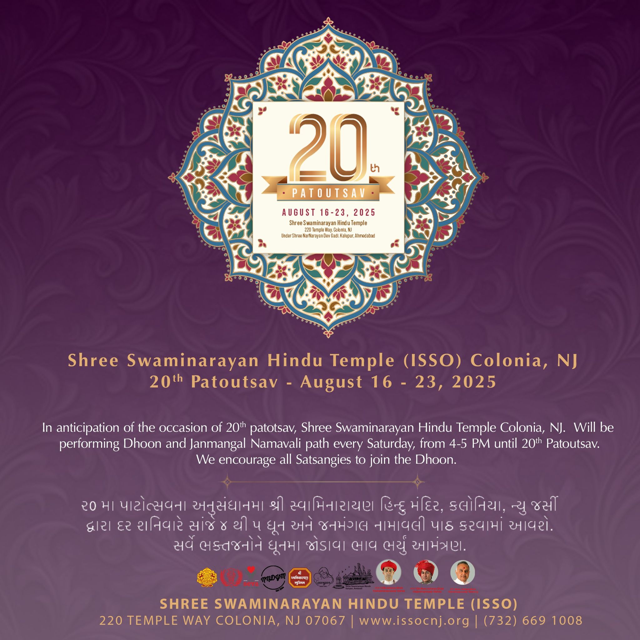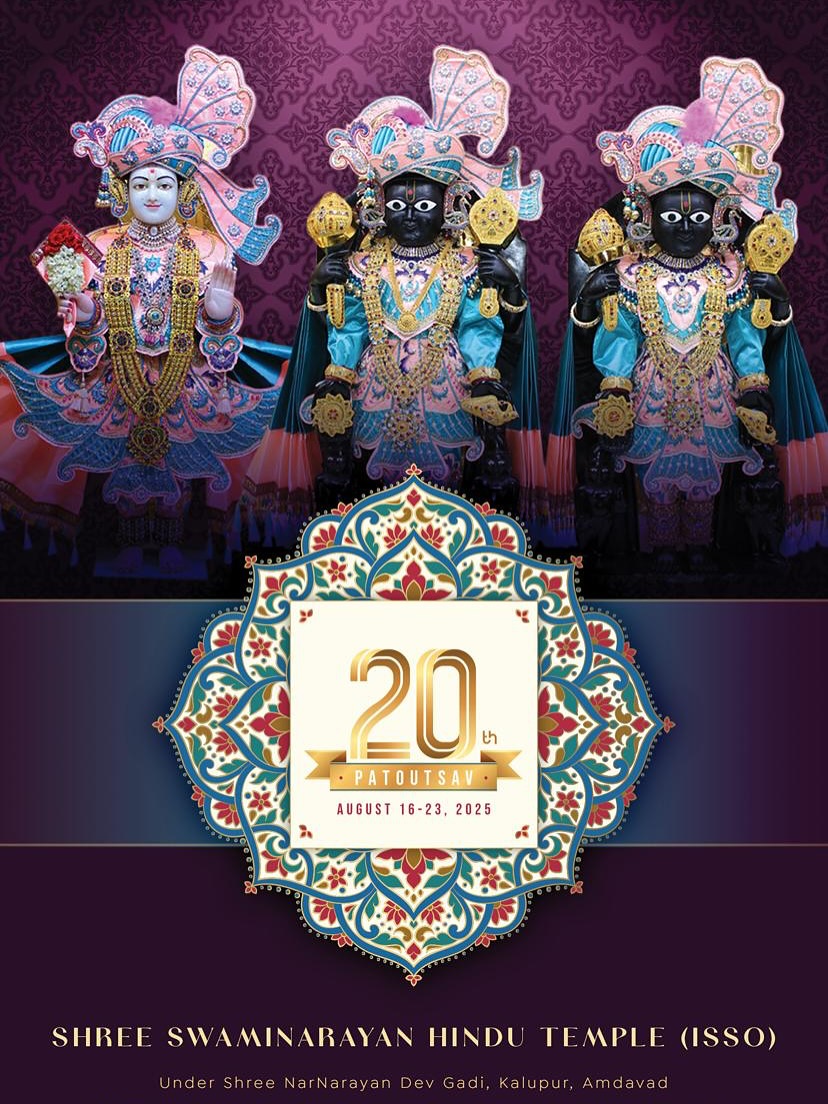 Shree Swaminarayan Mandir Colonia will be celebrating their 20th Patotsav from Saturday 16th August to Saturday 23rd August 2025
