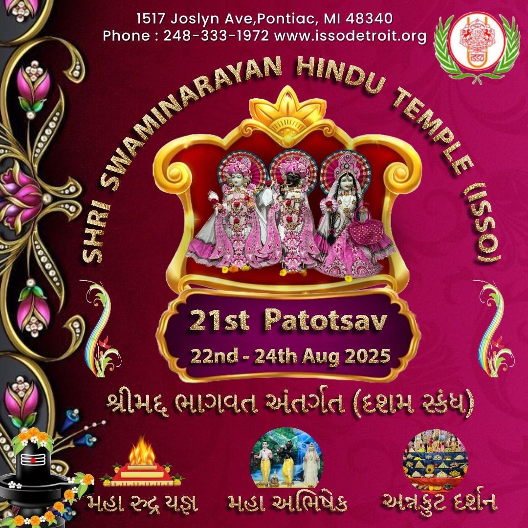 Shree Swaminarayan Mandir Detroit will be celebrating their 21st Patotsav from Friday 21st August to Sunday 24th August 2025