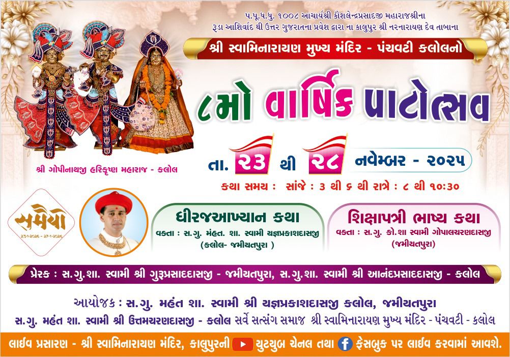 Shree Swaminarayan Mandir Panchvati Kalol will celebrate their 8th Patotsav where Dhirajaakyan and Shikshapatri Bhashya Katha will be recited from Sunday 23rd November to Friday 28th November 2024