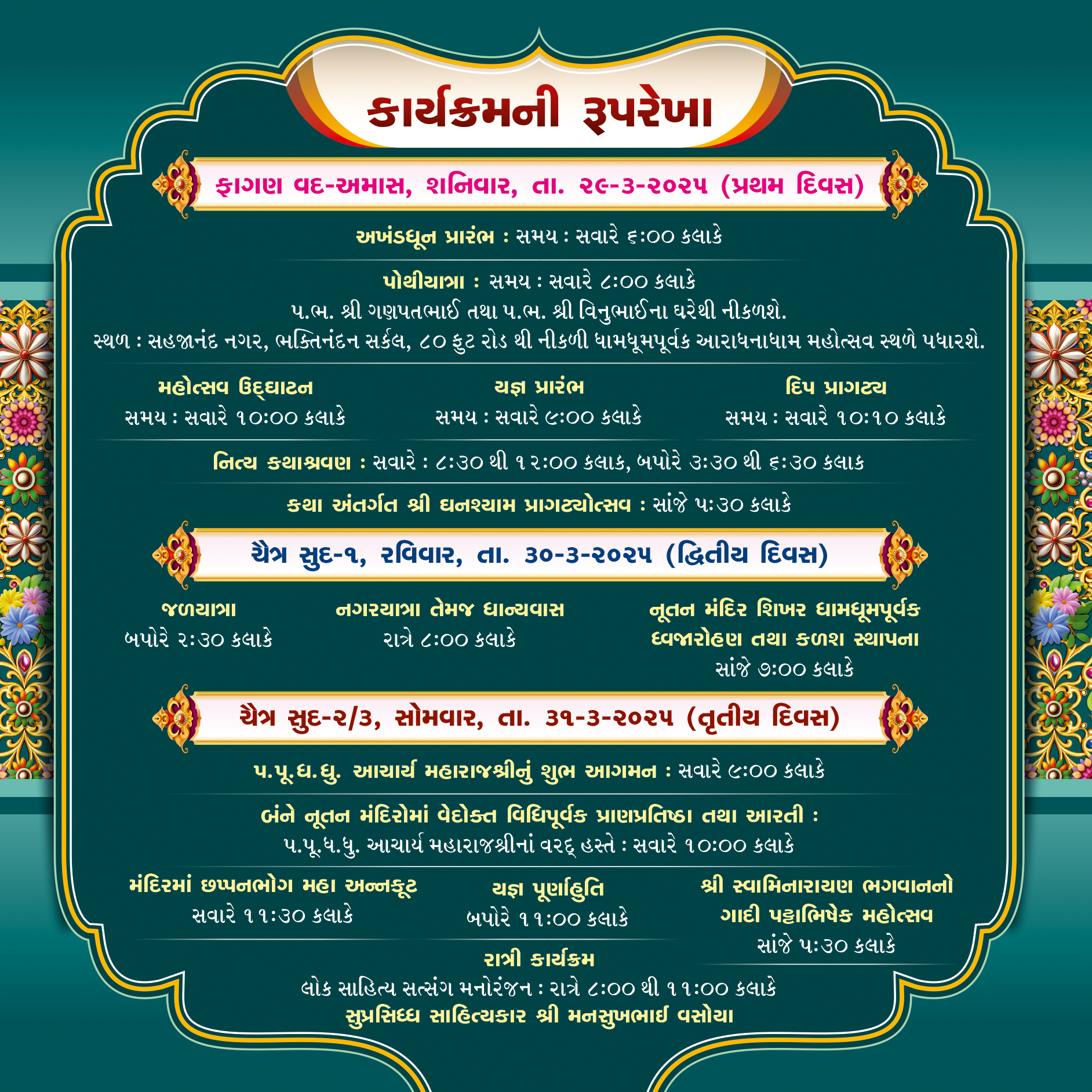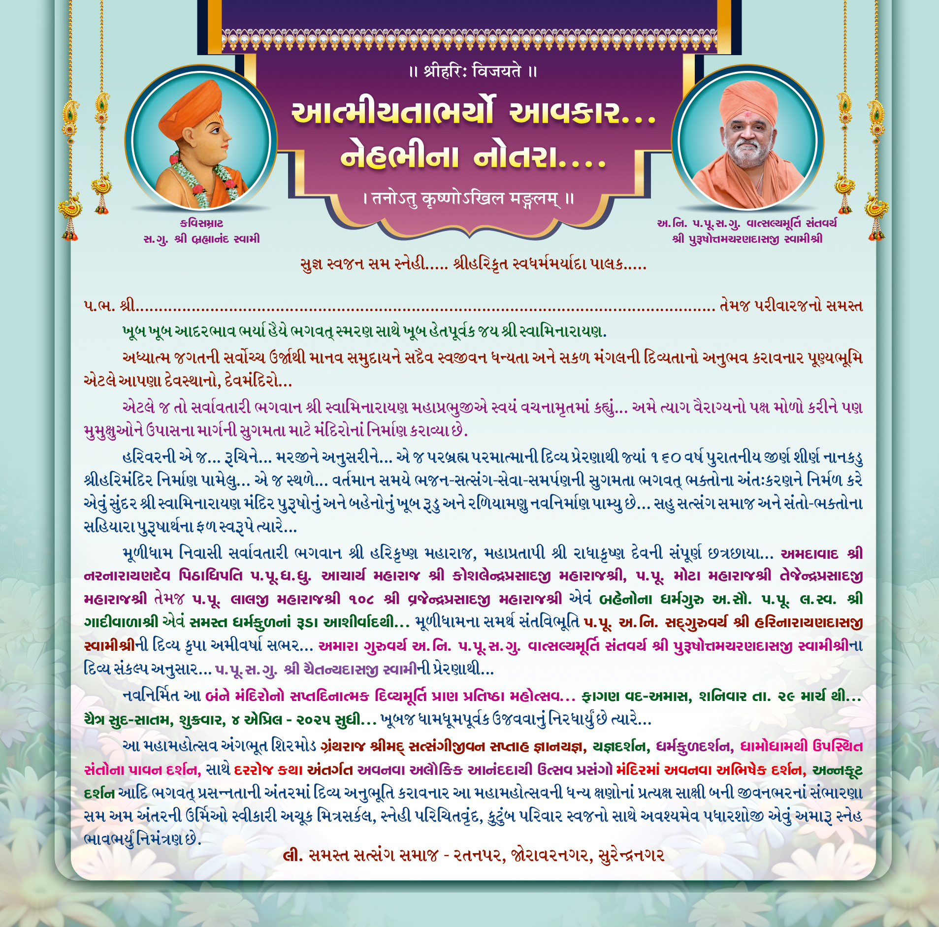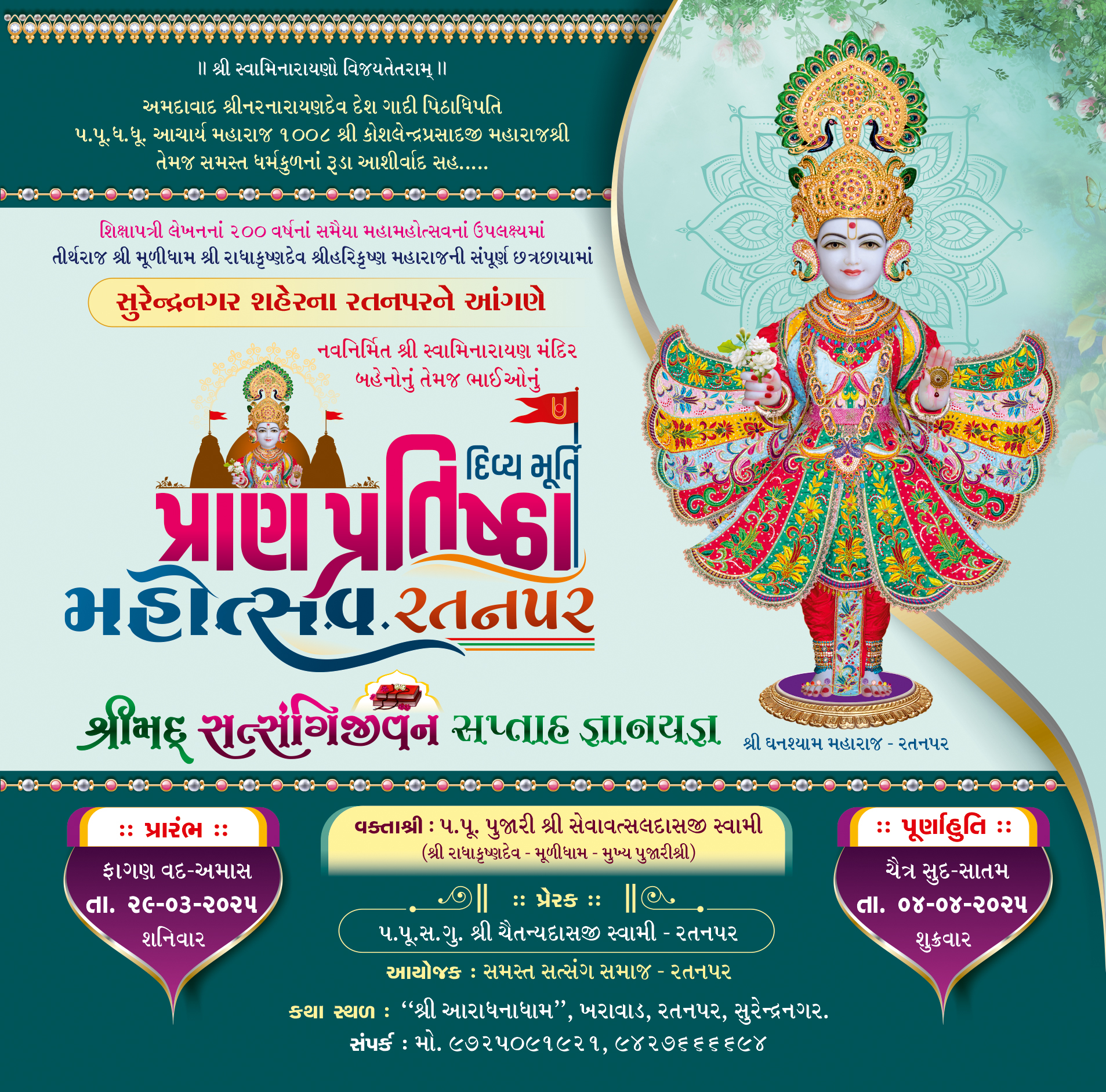 Shree Swaminarayan Mandir Ratanpur will celebrate their Murti Prathista Mahatosav and Shreemad Satsangi Jivan Katha from Saturday 29th March 2025 to Friday 4th April 2025