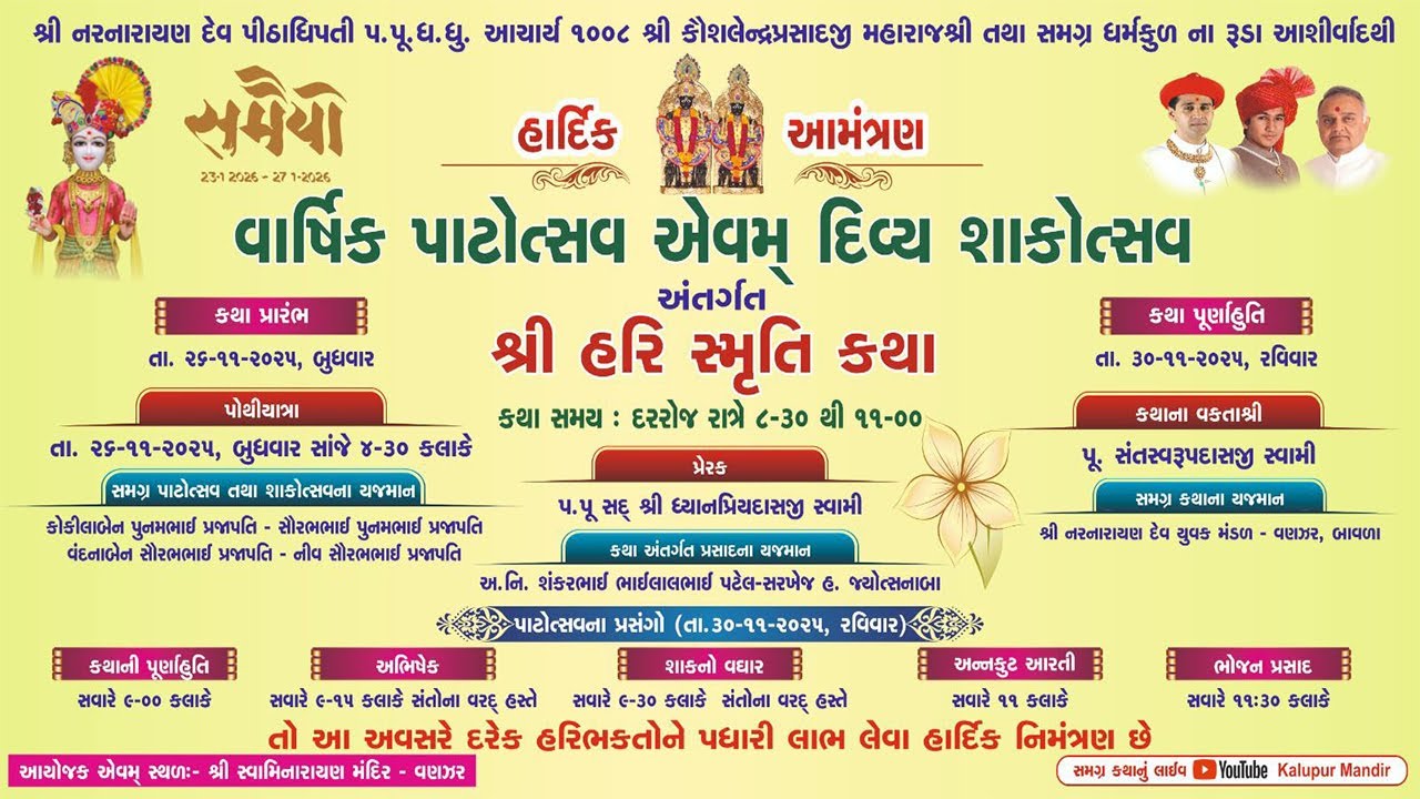 Shree Swaminarayan Mandir Vanzar will celebrate their 8th Patotsav and Shree Hari Smruti Katha will be recited from Wednesday 26th November 2025 to Sunday 30th November 2025