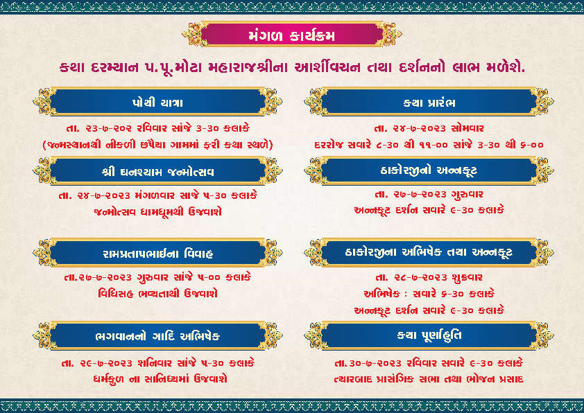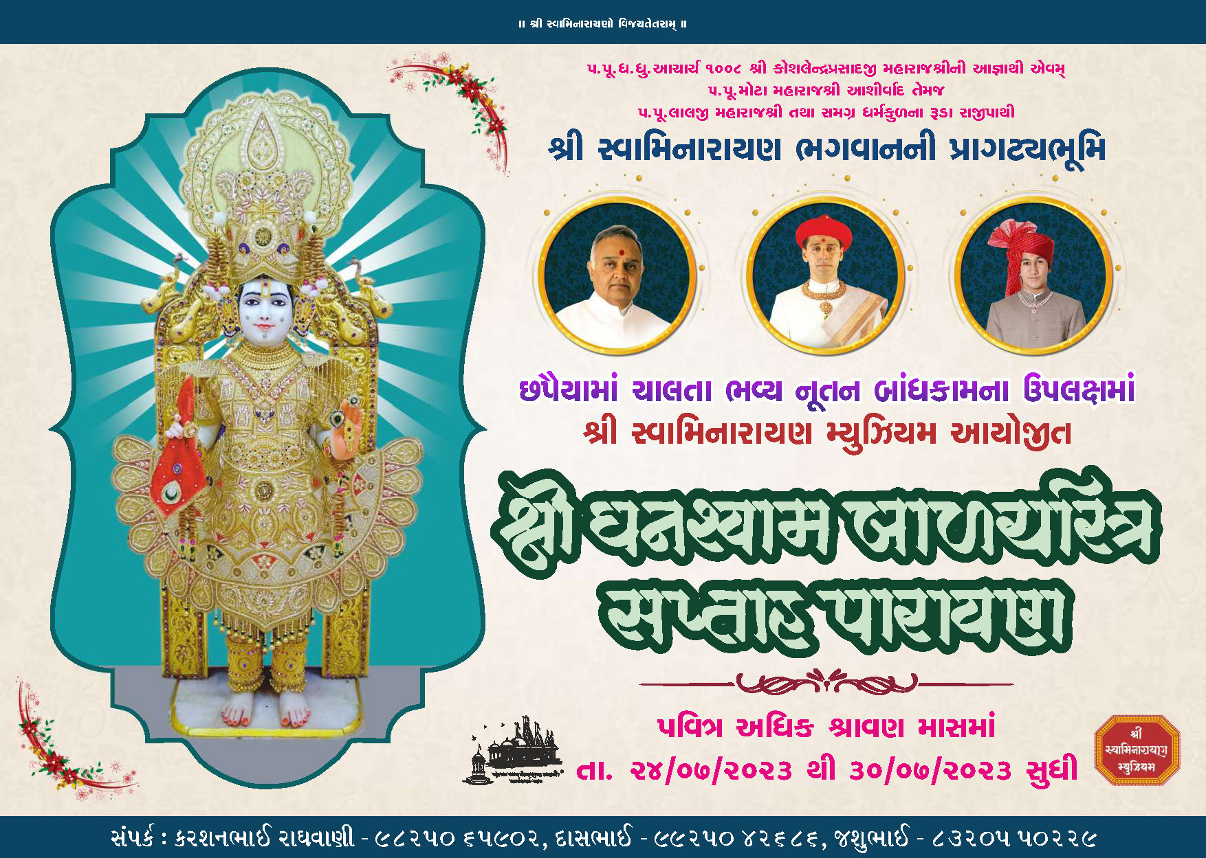 On the holy occasion of Adhik Maas and Chaturmaas, Shree Swaminarayan Mandir Chhapaiya will be hosting Shree Ghanshyam Balcharitra Katha Parayan from Monday 24th July to Sunday 30th July 2023