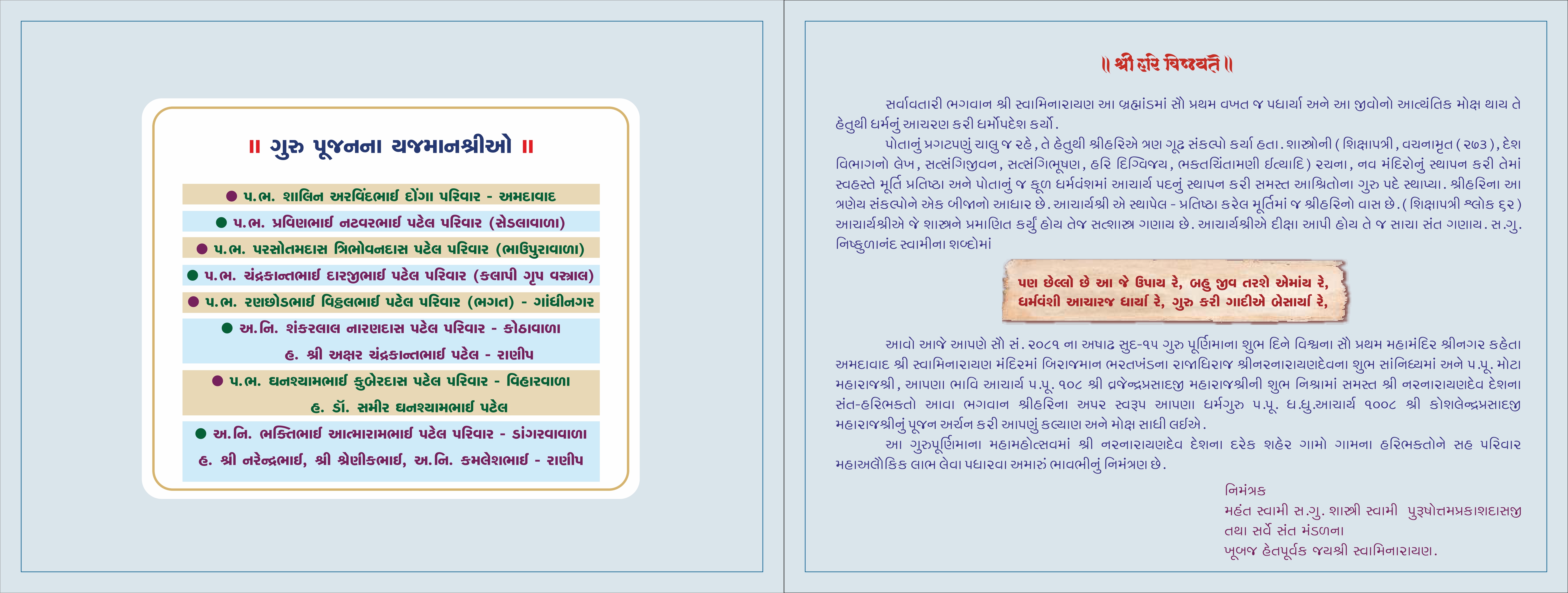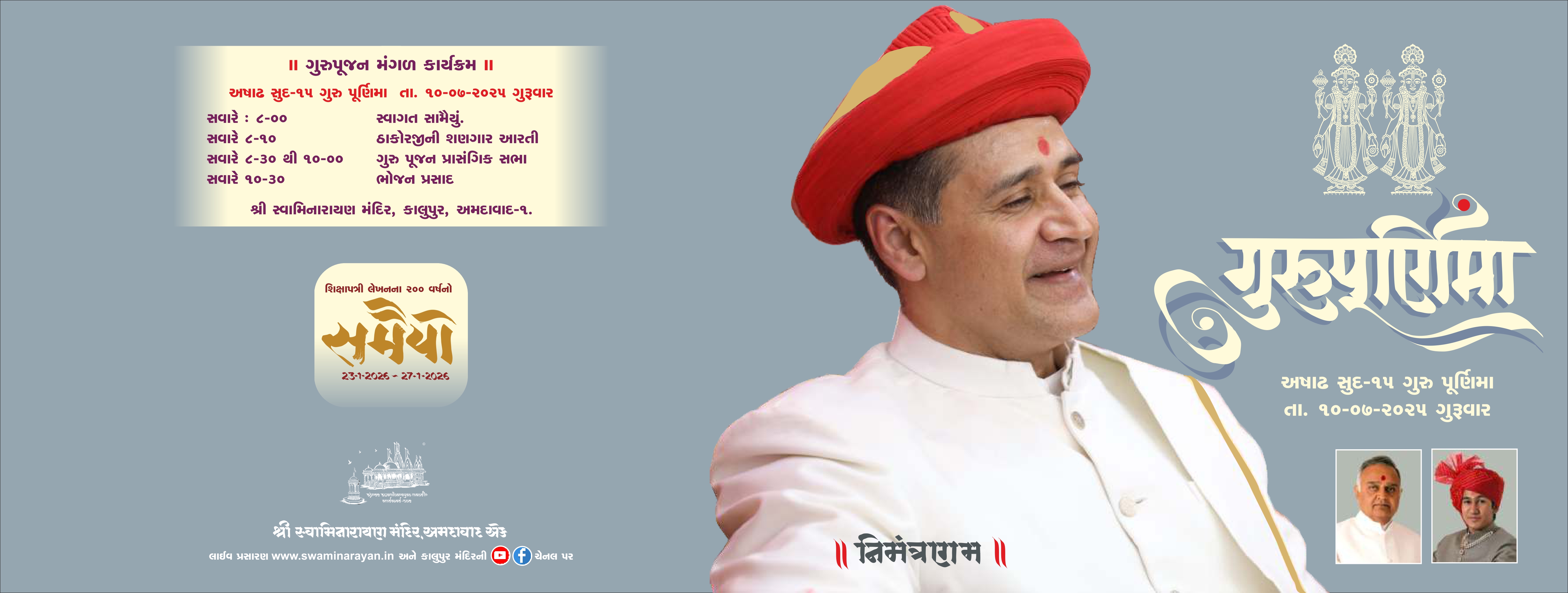 Shree Swaminarayan Mandir Kalupur and other Mandir's worldwide will be celebrating Guru Poornima Mahotsav on Thursday 10th July 2025.