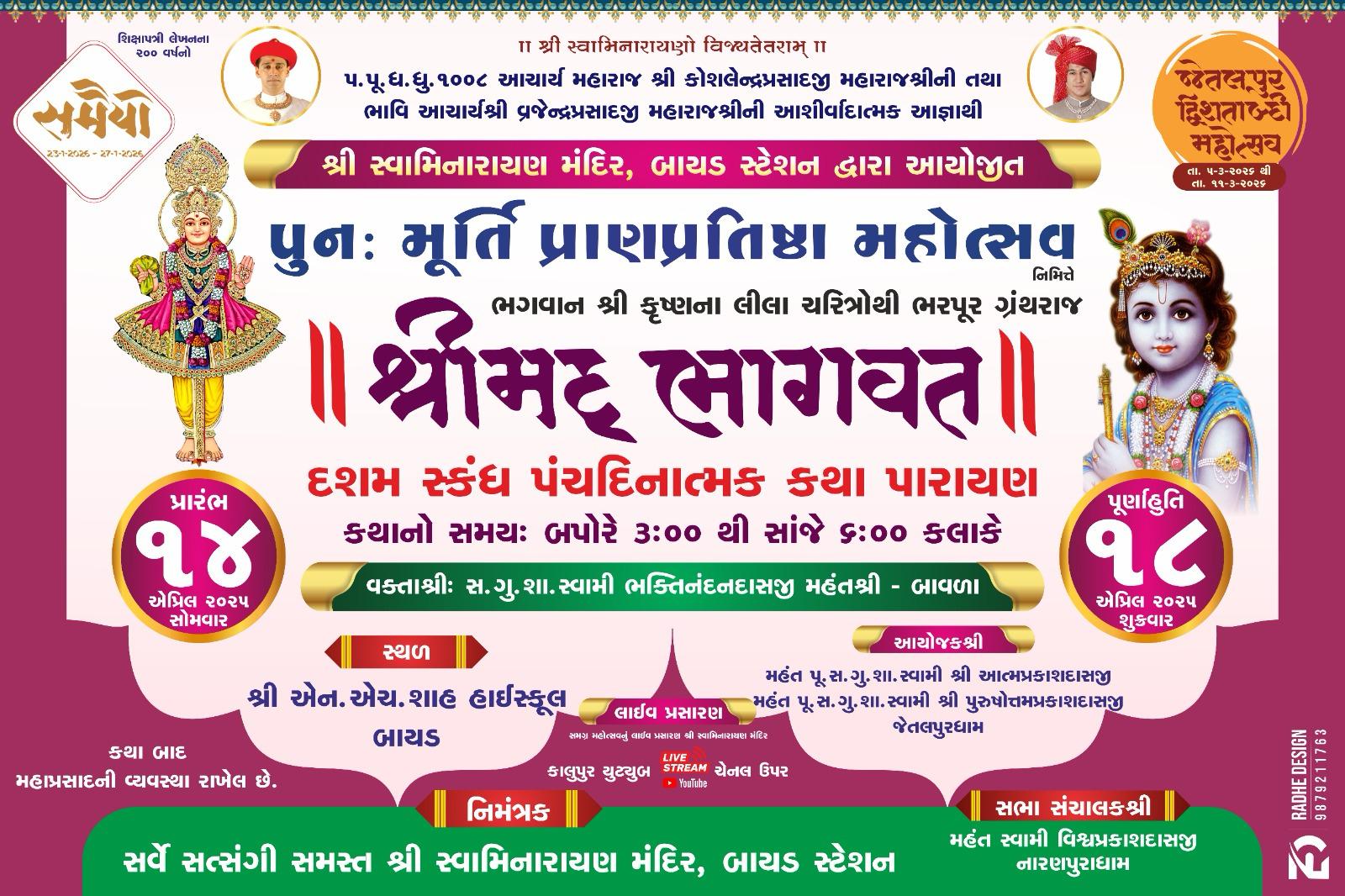 Shree Swaminarayan Mandir Bayad will be celebrating their Murti Prathishta Mahotsav from Monday 14th April to Friday 18th April 2025