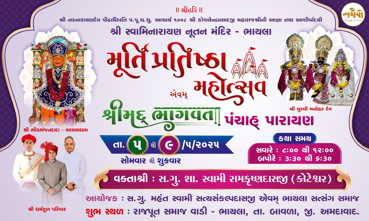 Shree Swaminarayan Mandir Bhayla will be celebrating their Murti Prathishta Mahotsav from Monday 5th May to Friday 9th May 2025