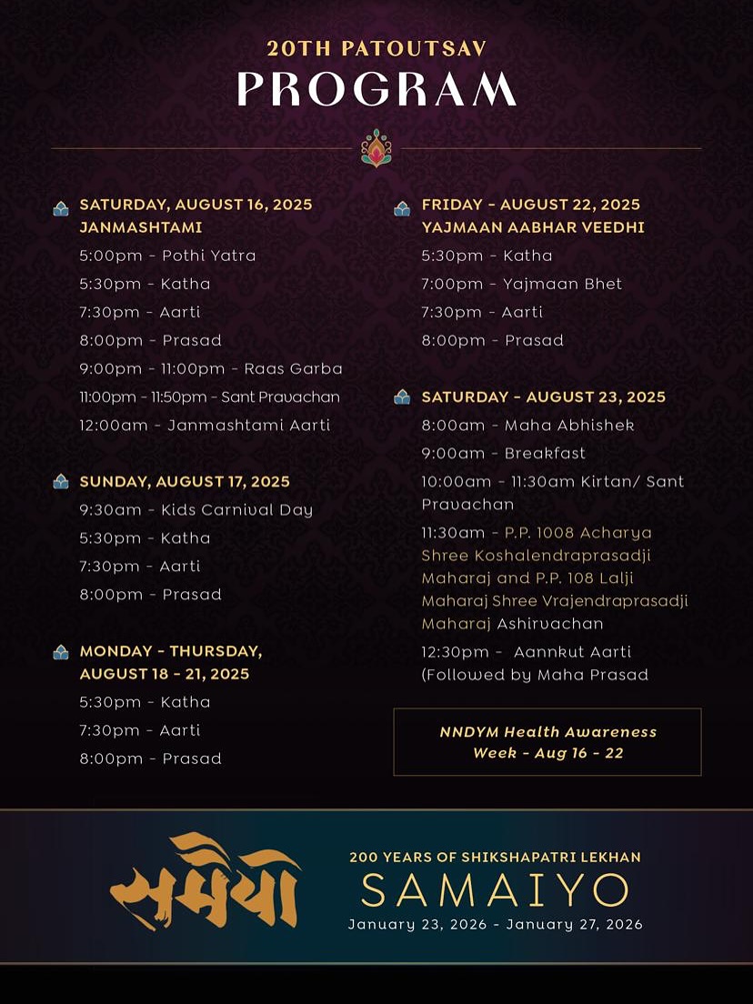 Shree Swaminarayan Mandir Colonia will be celebrating their 20th Patotsav from Saturday 16th August to Saturday 23rd August 2025