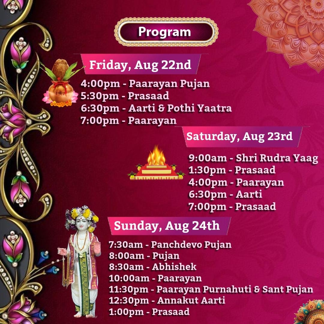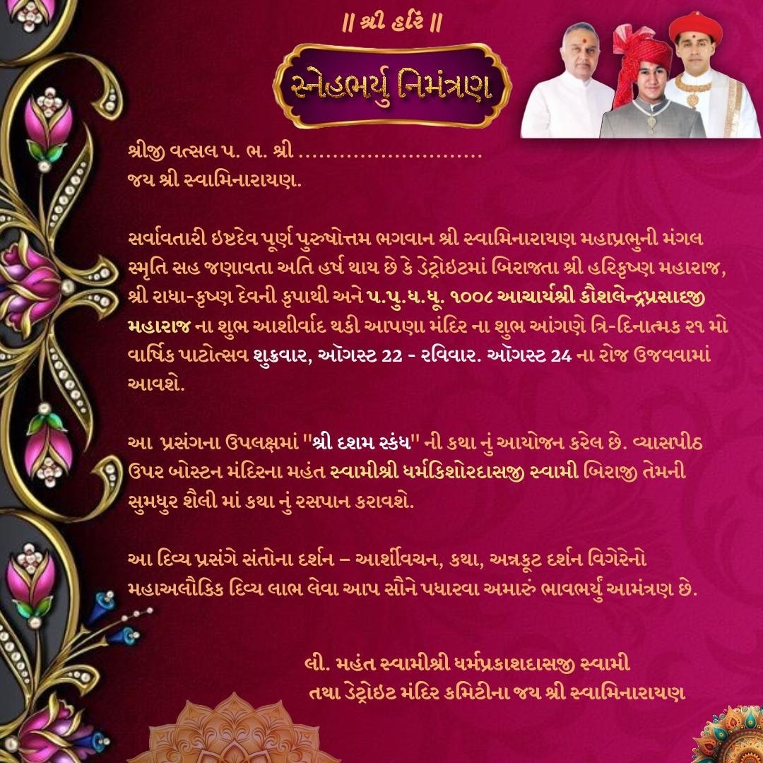 Shree Swaminarayan Mandir Detroit will be celebrating their 21st Patotsav from Friday 21st August to Sunday 24th August 2025