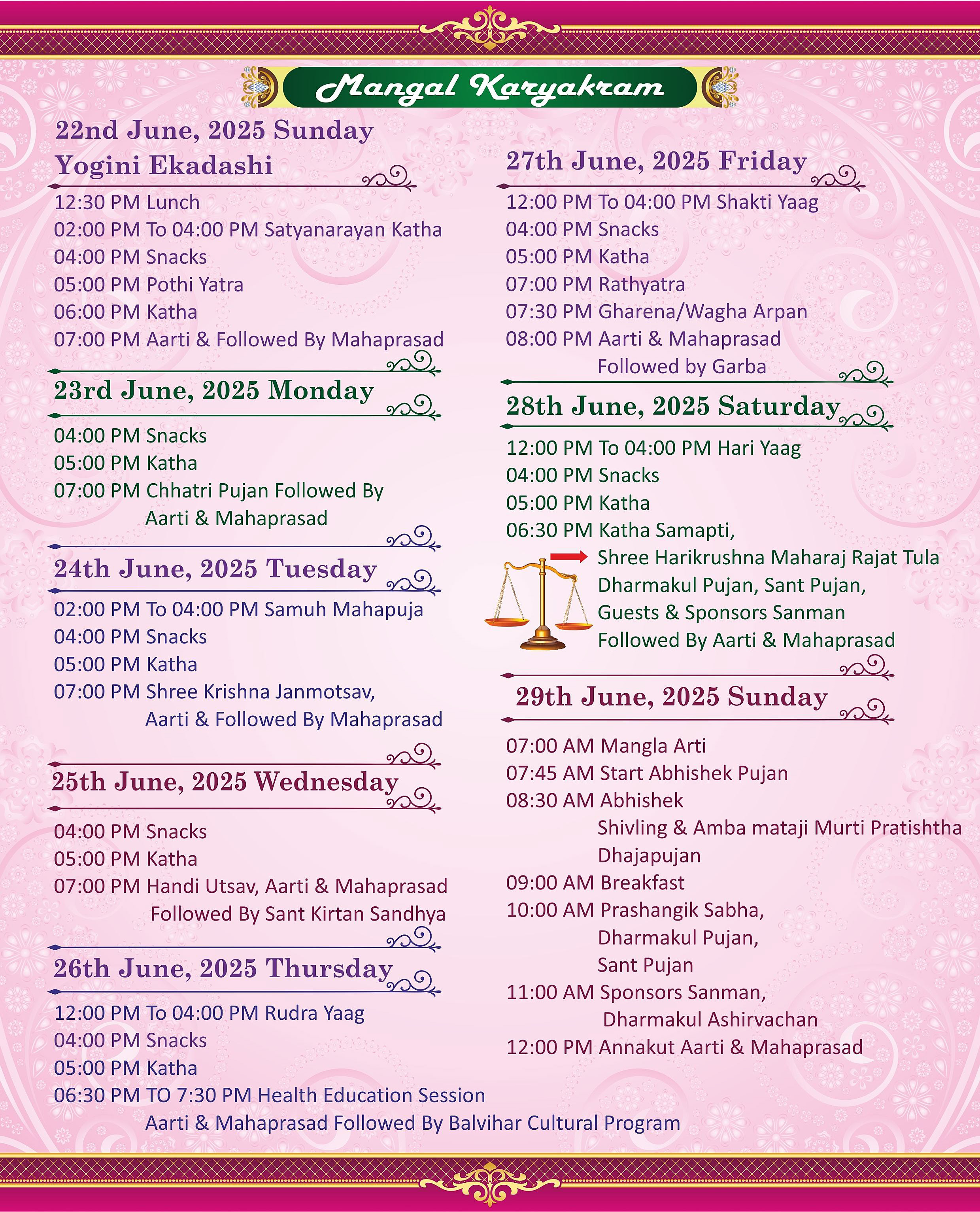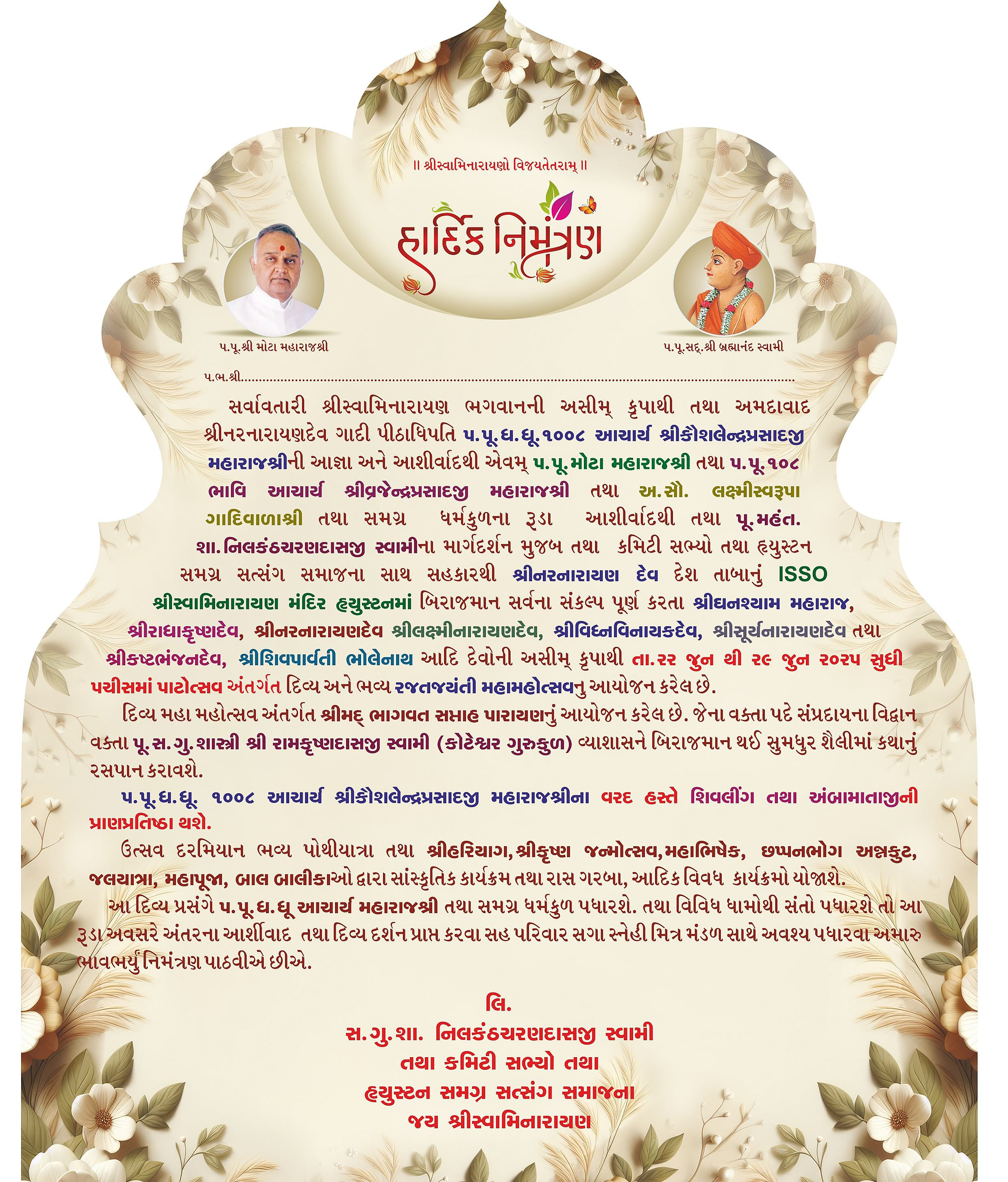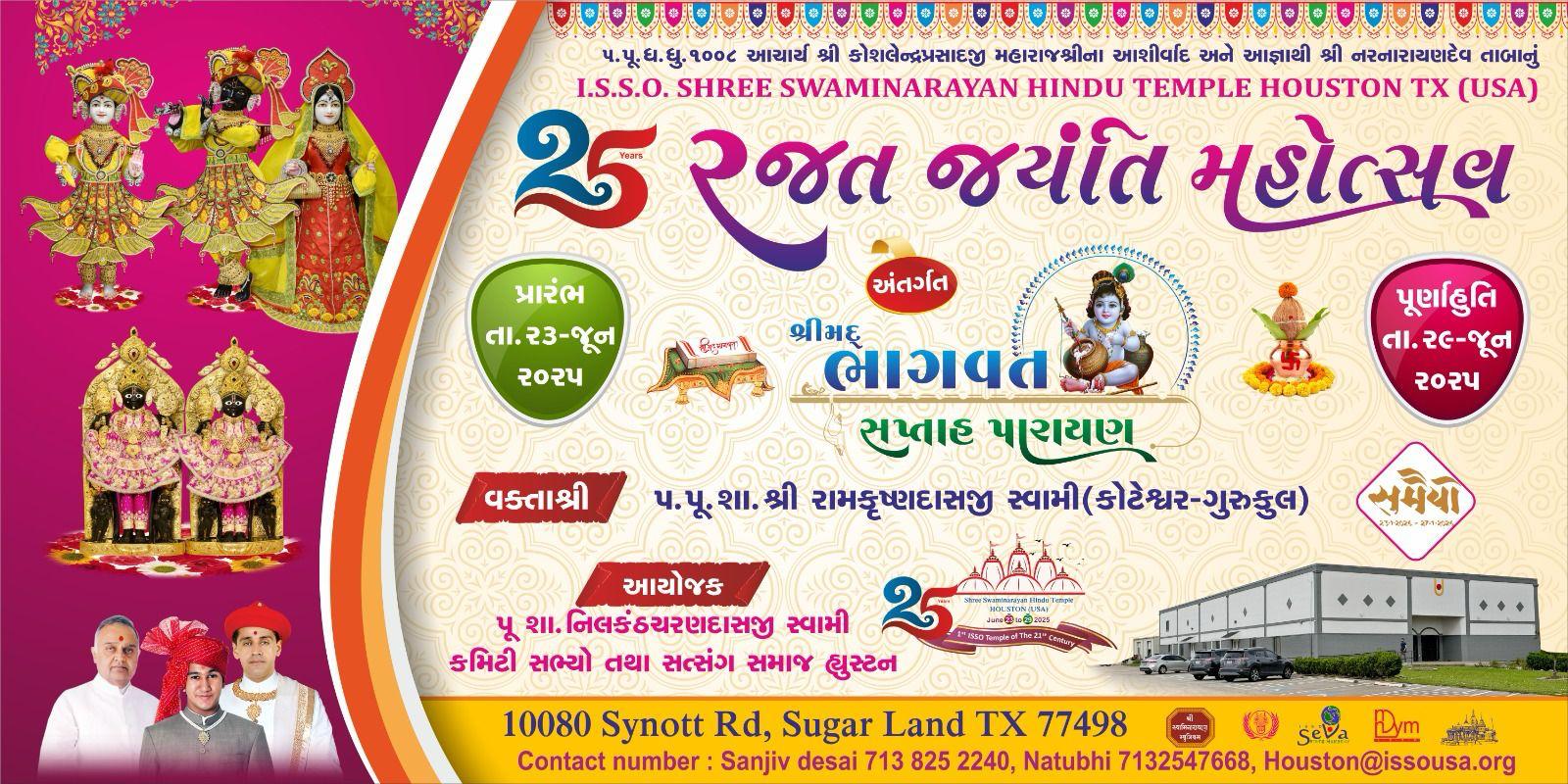 Shree Swaminarayan Mandir Houston will be celebrating 25th Patotsav, Rajat Jayanti Mahotsav from Monday 23rd June to Sunday 29th June 2025