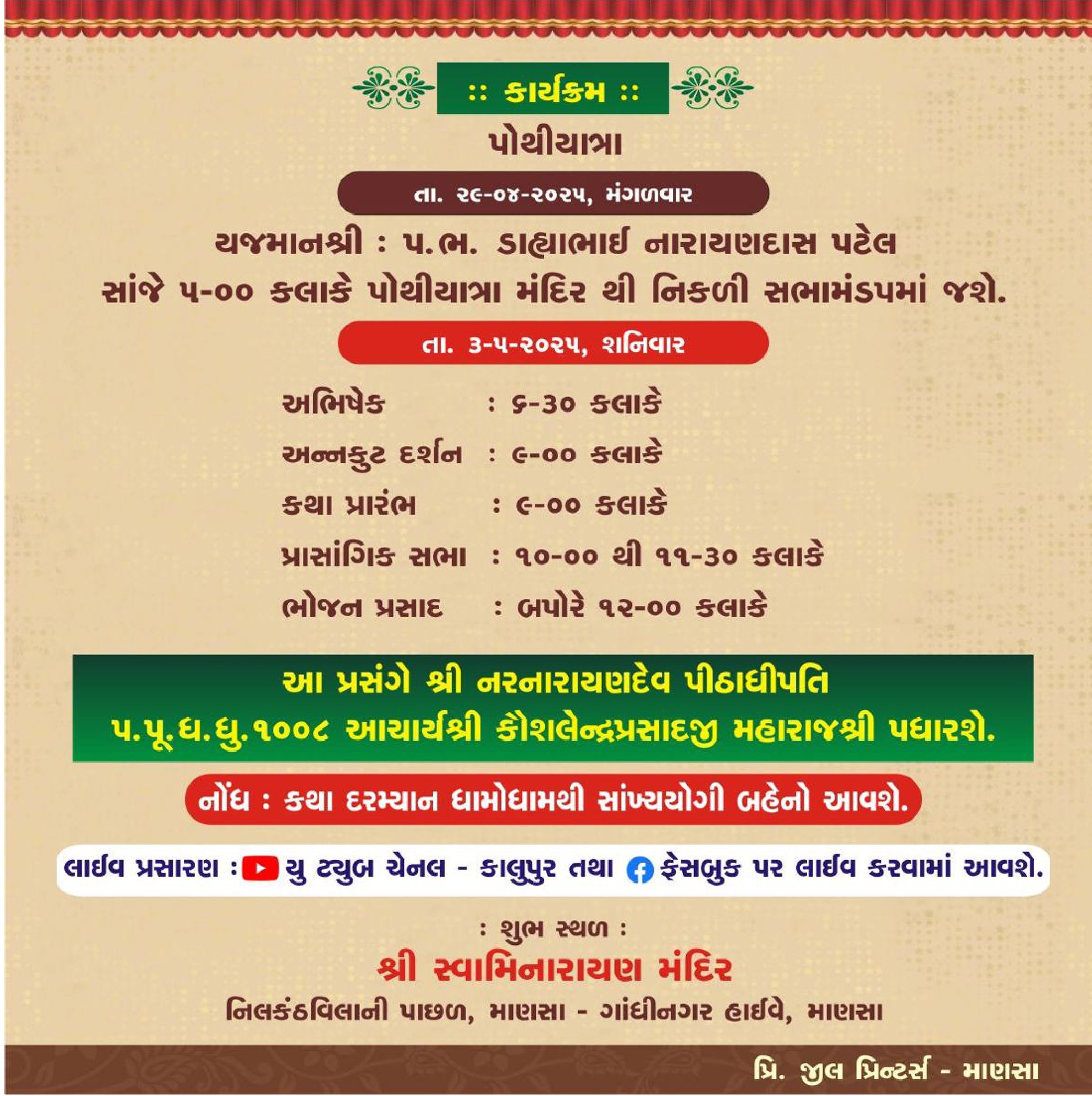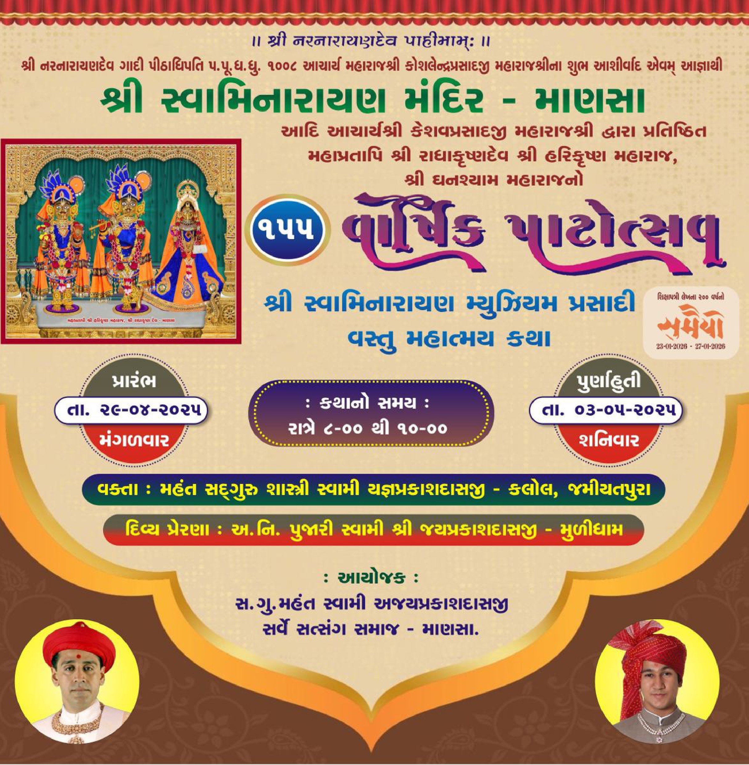Shree Swaminarayan Mandir Mansa will celebrate their 155th Patotsav and Shree Swaminarayan Museum Vastu Mahatmay Katha will be recited from Tuesday 29th April to Saturday 3rd May 2025.