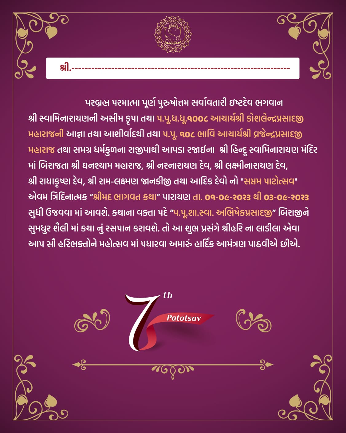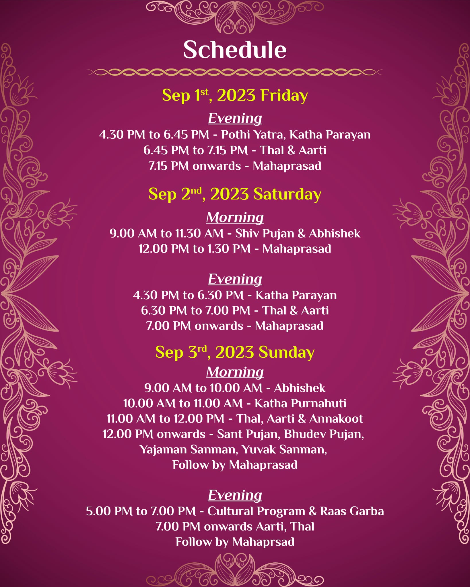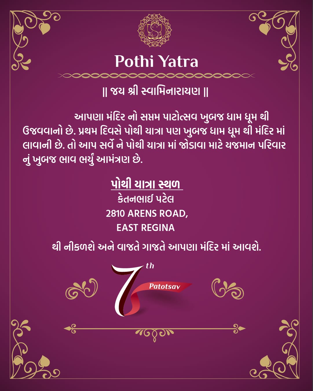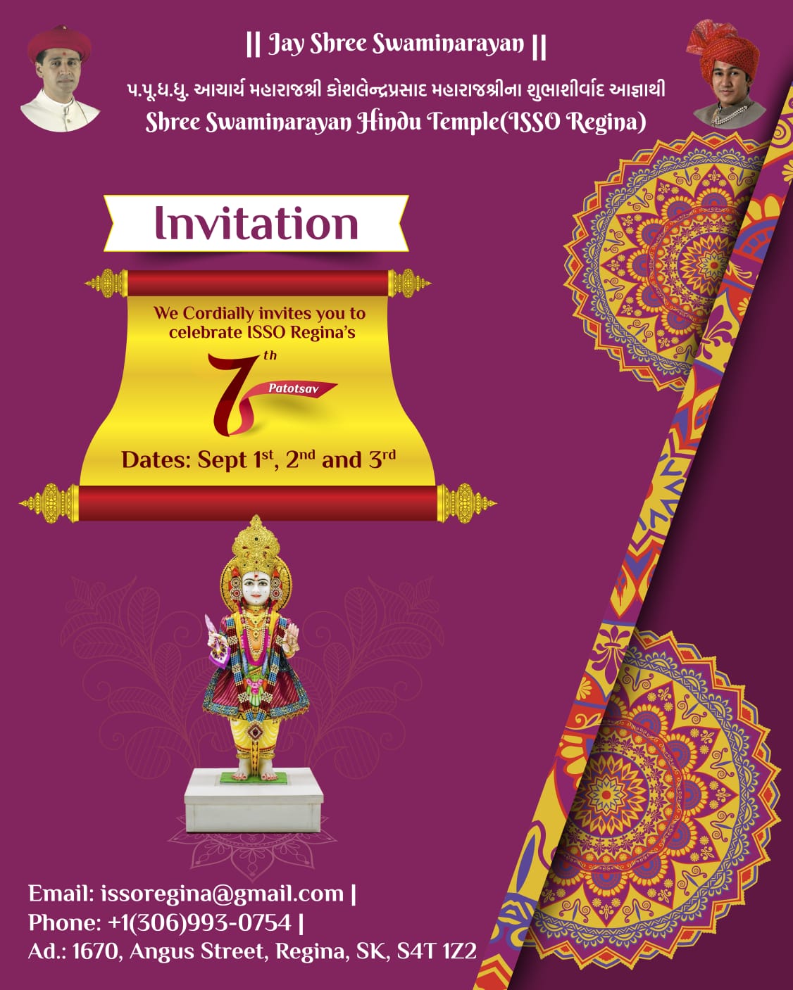 Shree Swaminarayan Mandir Regina, Canada will be celebrating their 7th Patotsav celebrations from Friday 1st September to Sunday 3rd September 2023. For full itinerary, please see poster.